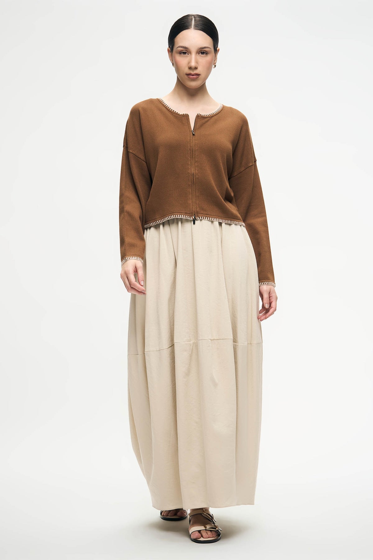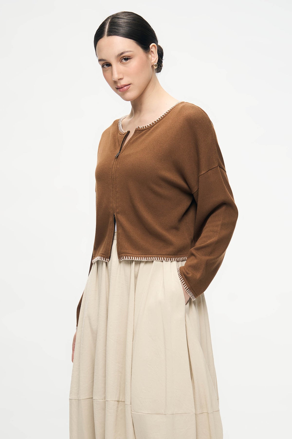 - Design Details: Blanket Stitch, Center Front Zipper, Dropped Shoulders, Long Sleeves
