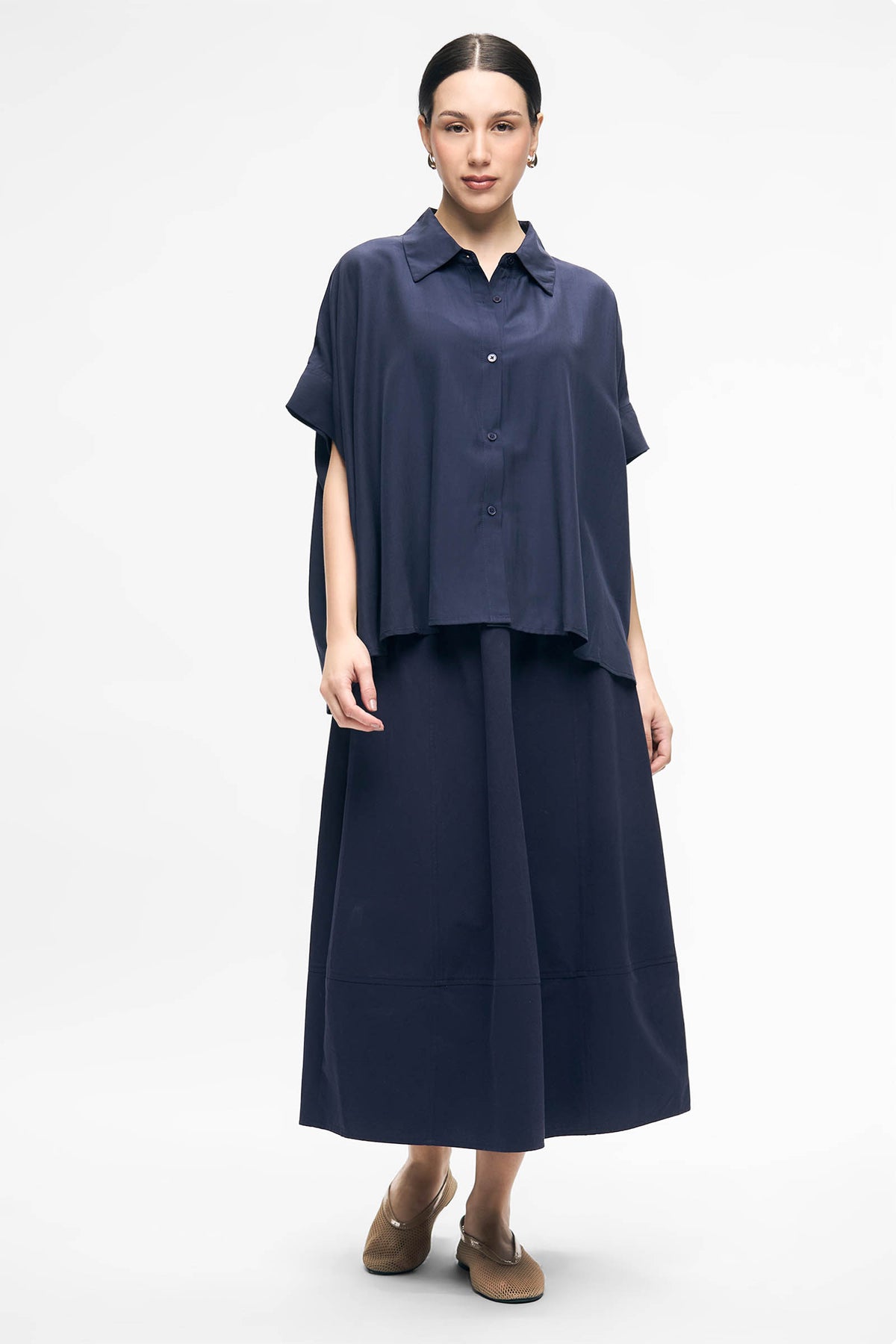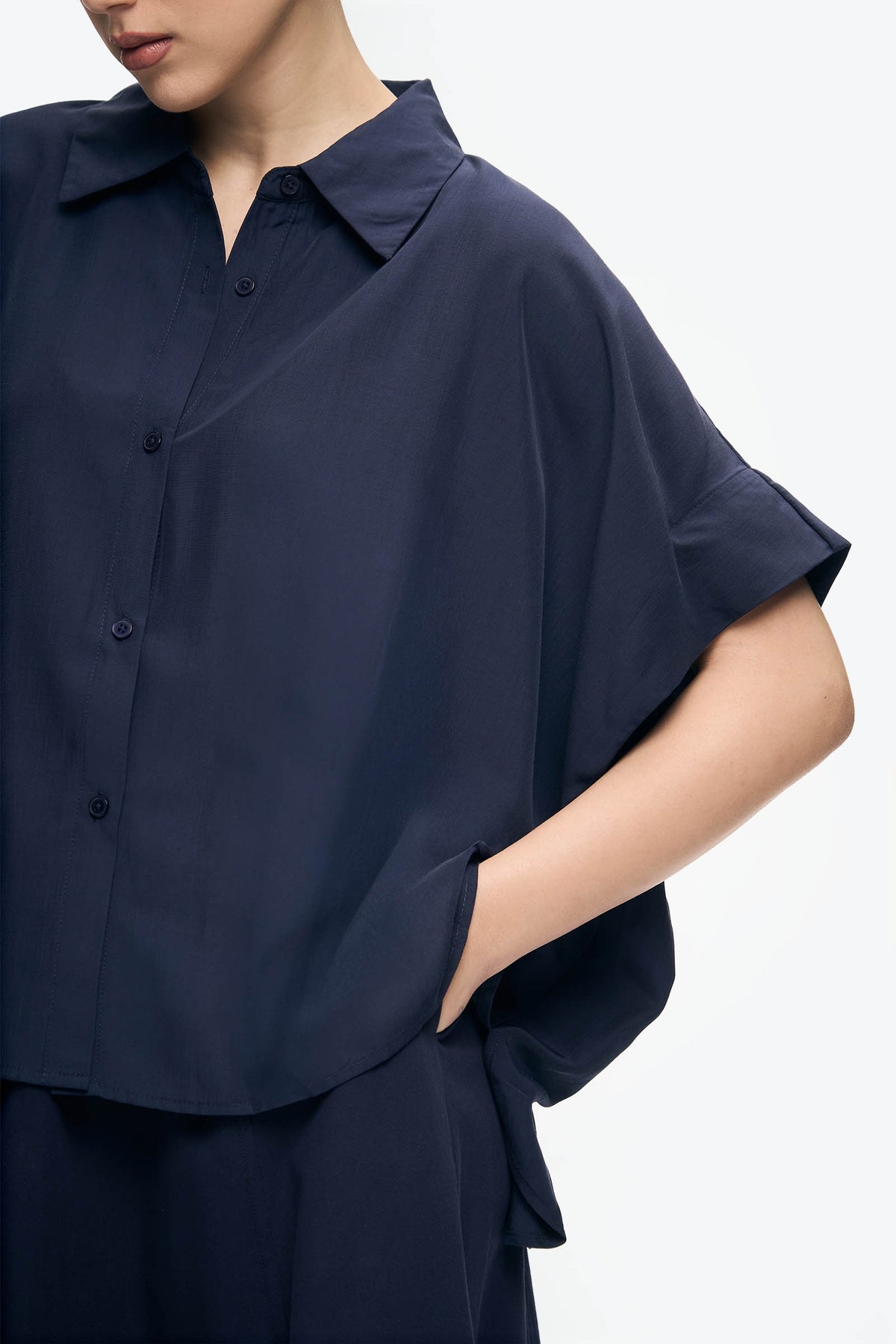 - Design Details: Shirt Collar, Placket, Buttons, Tucked Sleeves, Square Silhouette