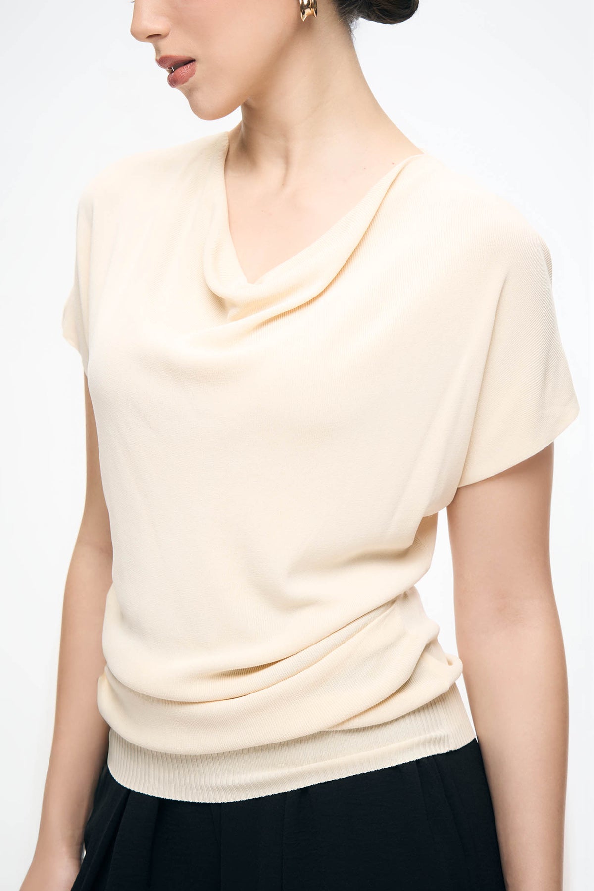 • Design Details: Cowl Neck, Gathering on Waist, Extended Shoulders