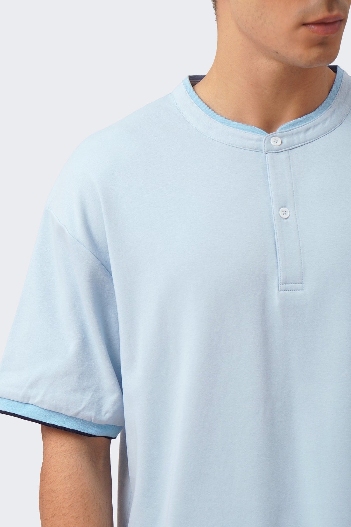 The model is 189cm/6'2" and wears a size Extra Large for color Pale Blue
