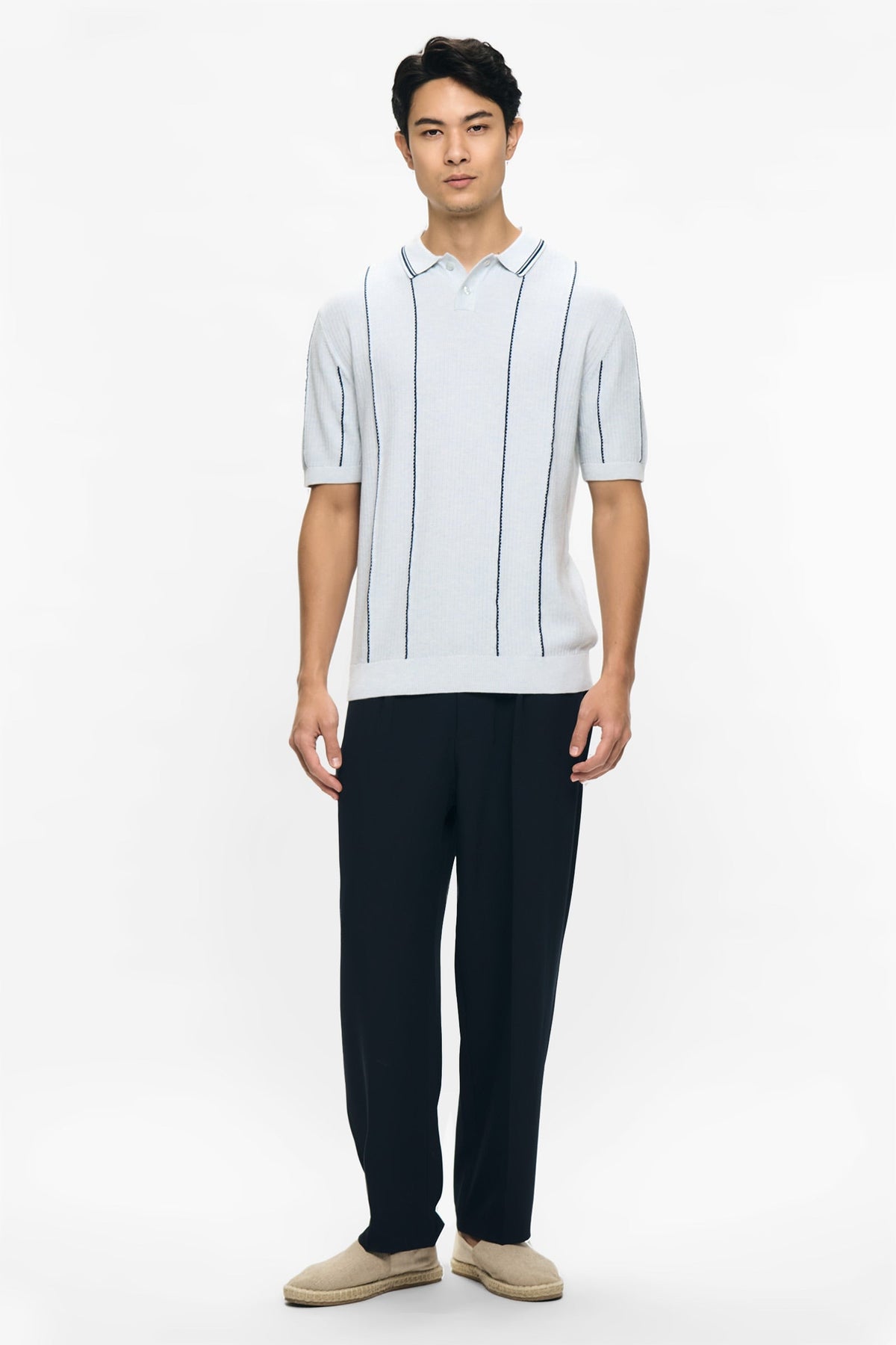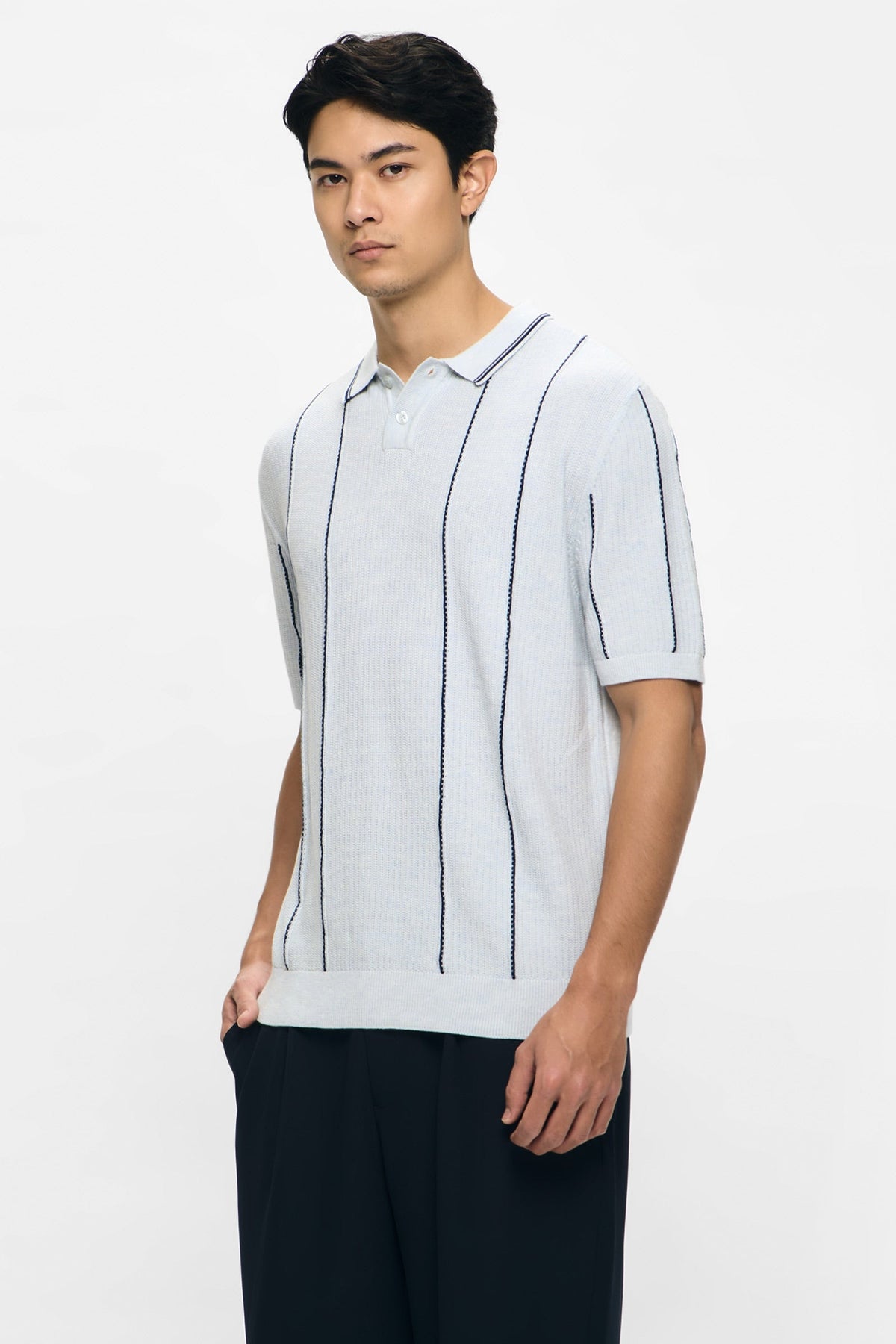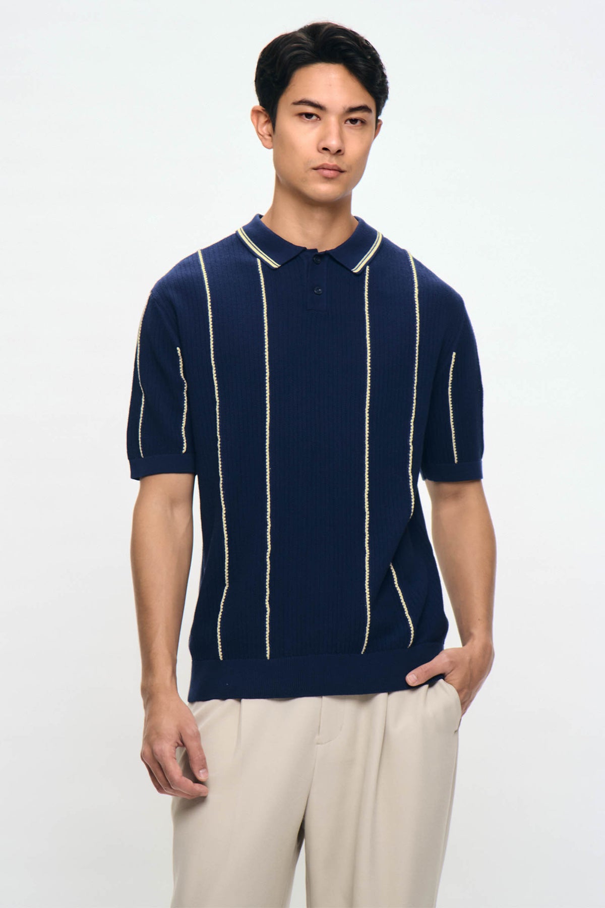 • Design Details: Regular Collar, 2 Button Functional Placket, Short Sleeve, Ribbed, Collar, Cuff and Hem, Mixed Texture Knit