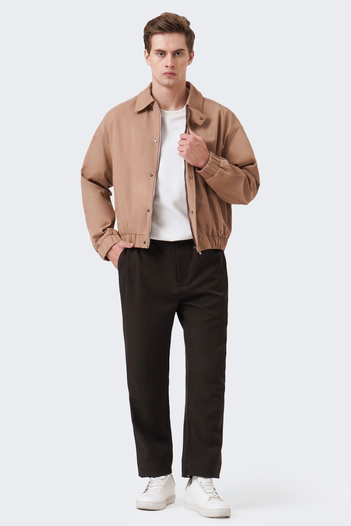 • Design Details: Regular Collar, Hidden Placket, Zipper Closure with Snap Buttons and Extended Tab, Garterized Cuff and Hem Band, Cut & Sew Sleeve, Back Tab with Inverted Pleat