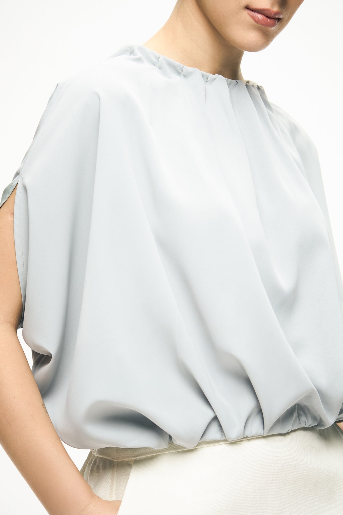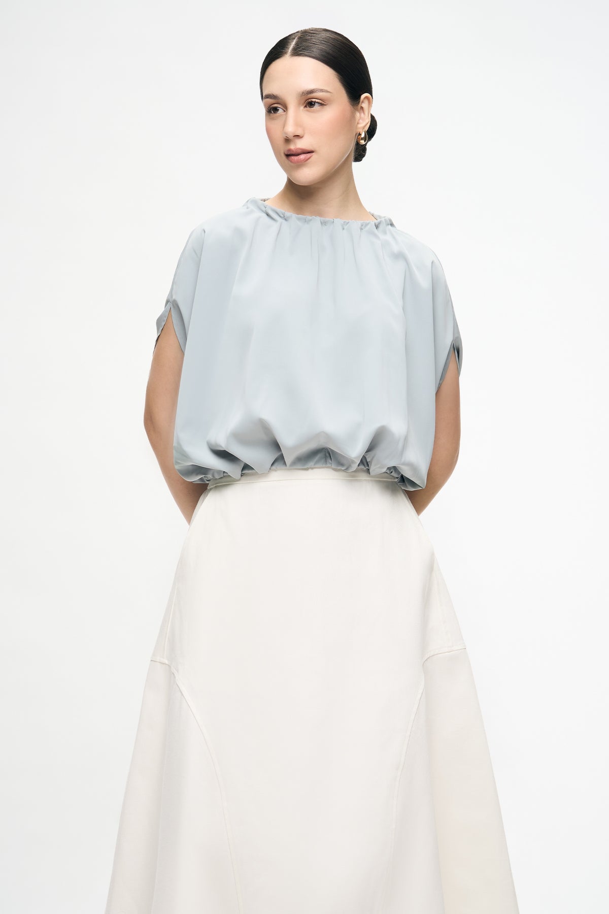 Women's Spliced Sleeves Gathered Neck And Hem Blouse