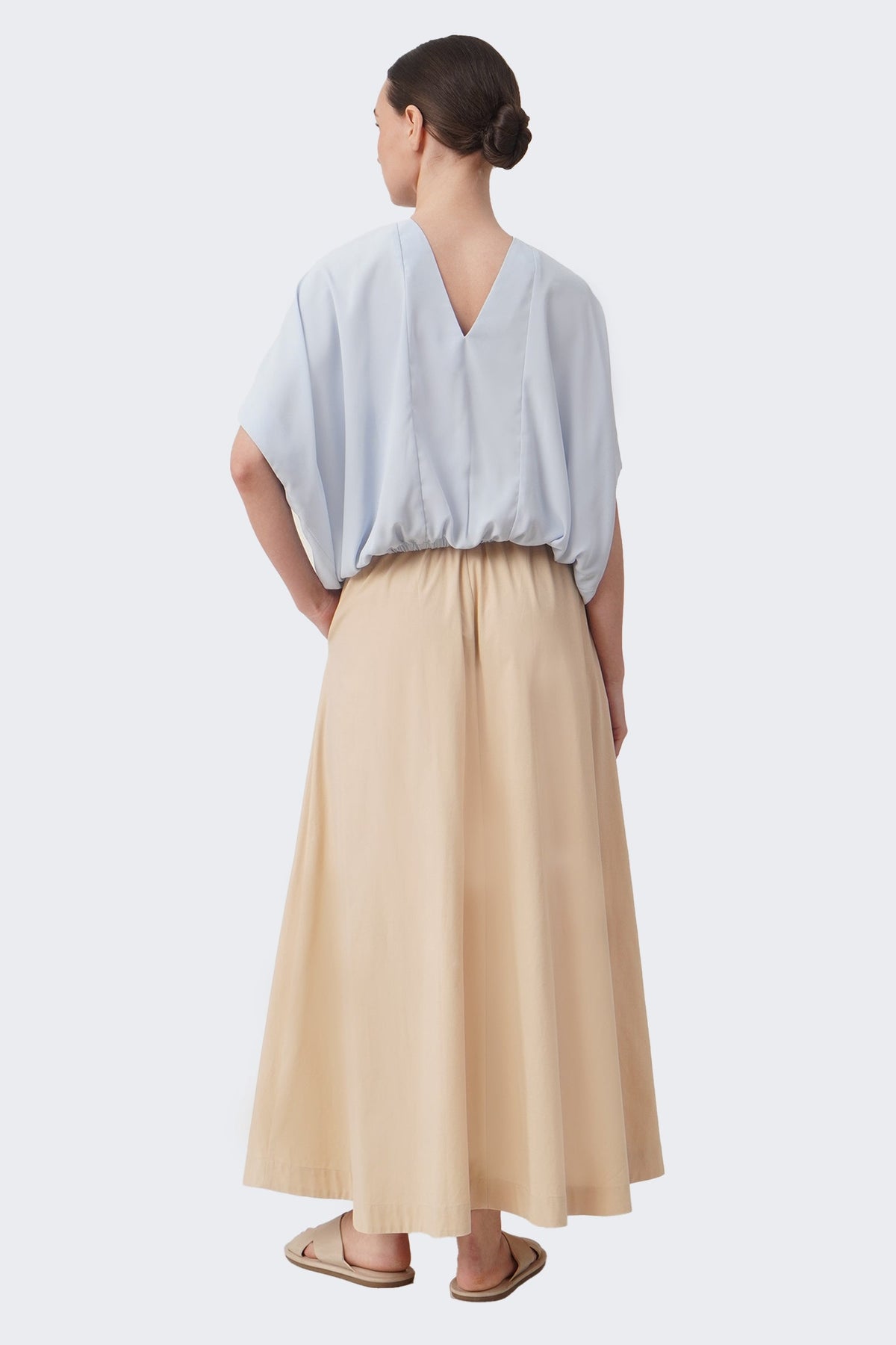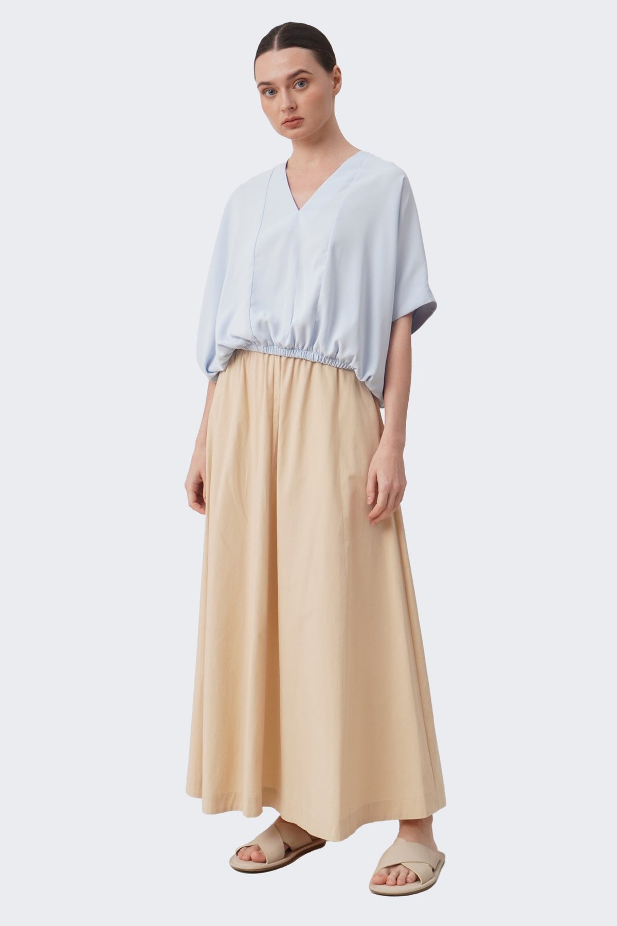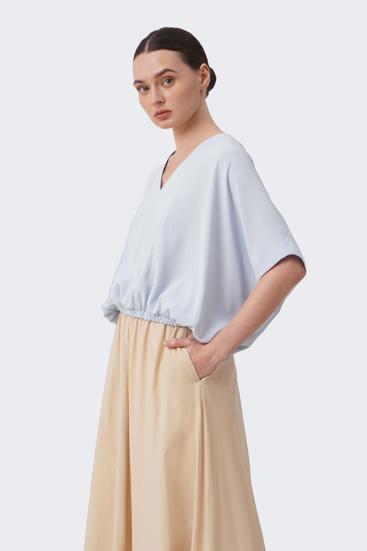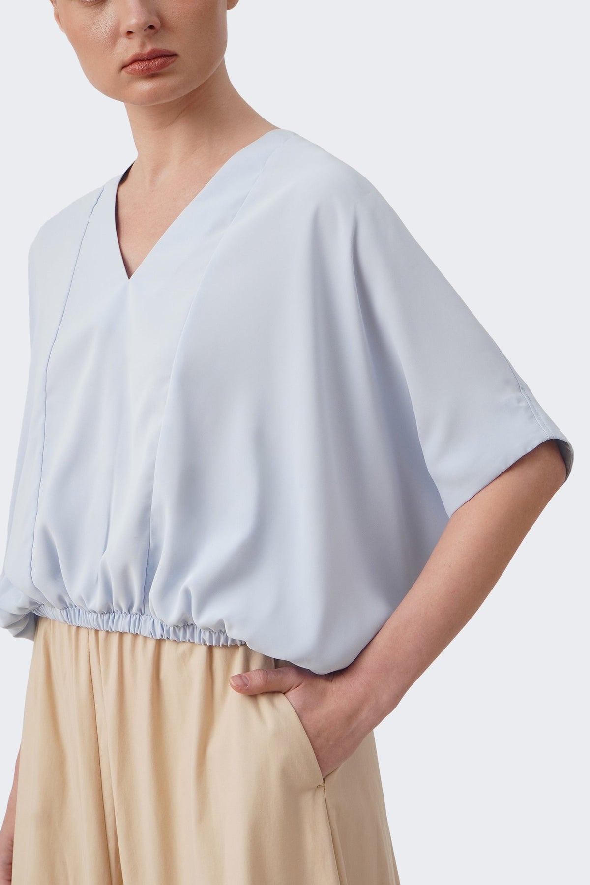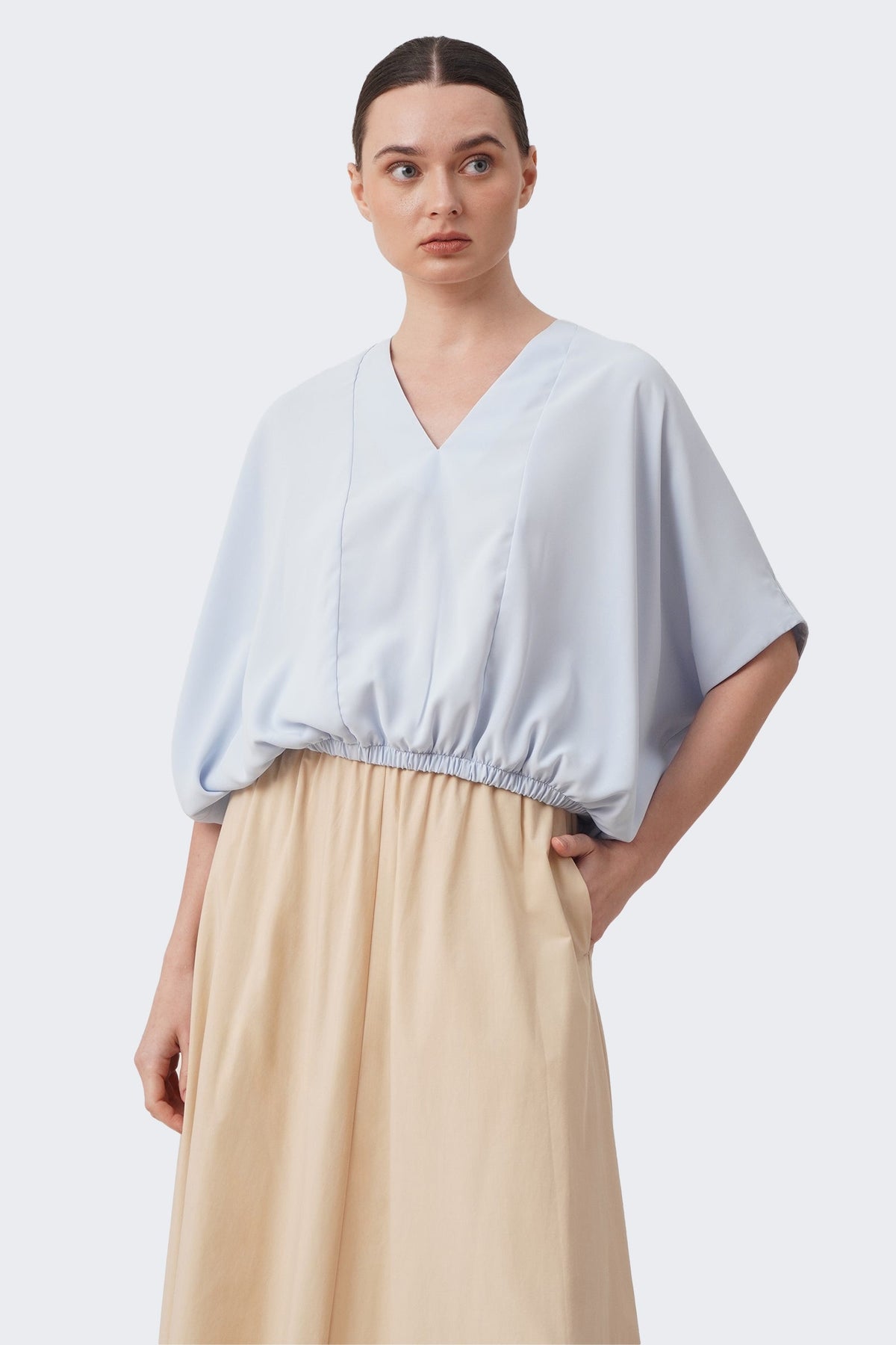 The model is 171cm/5'6" and wears a size Medium for color Pale Blue