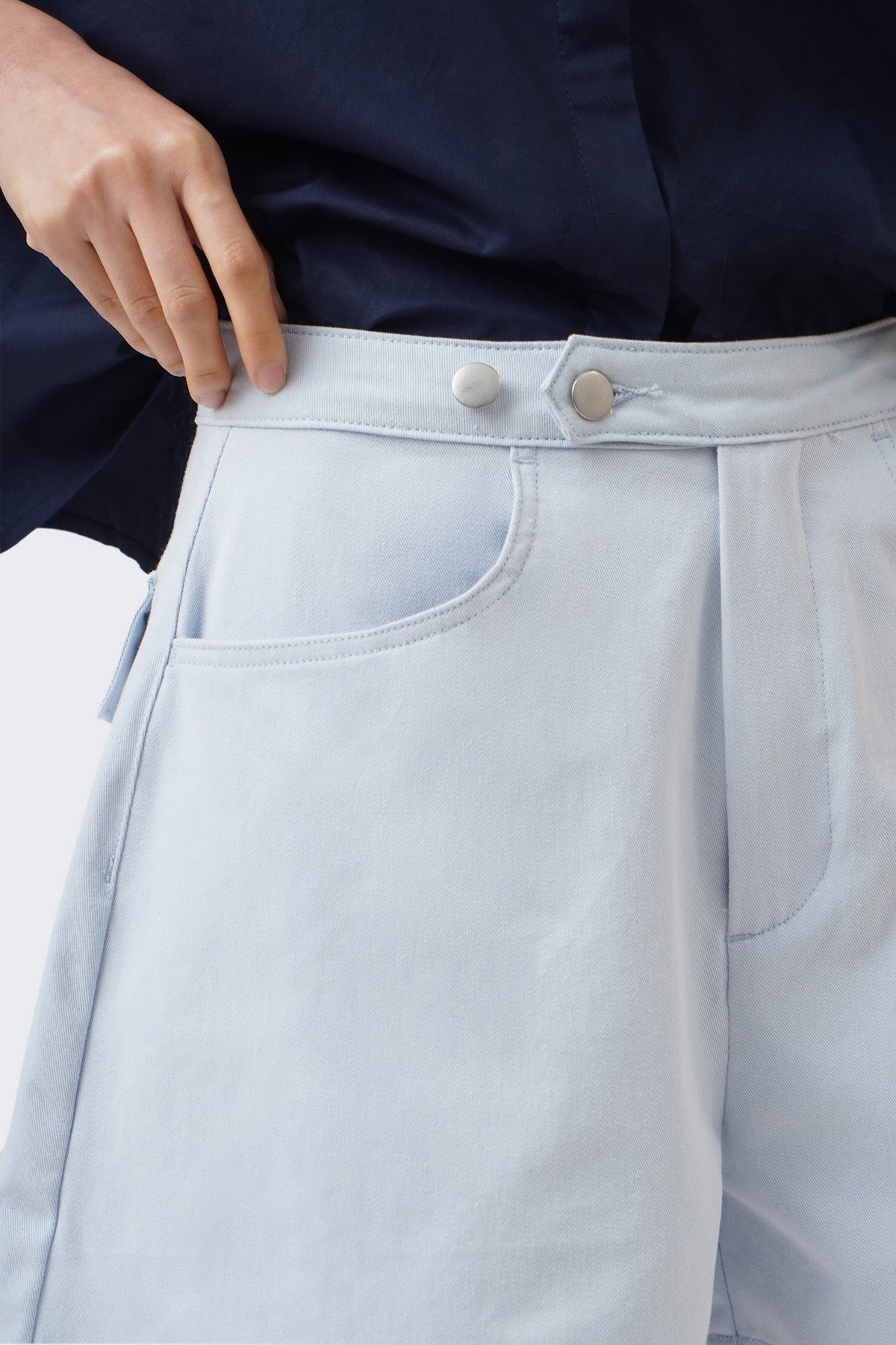 • Design Details: Adjustable Waistband with Shank Buttons, Functional Zipper, Front Scoop Pockets and Back Flap Pockets
