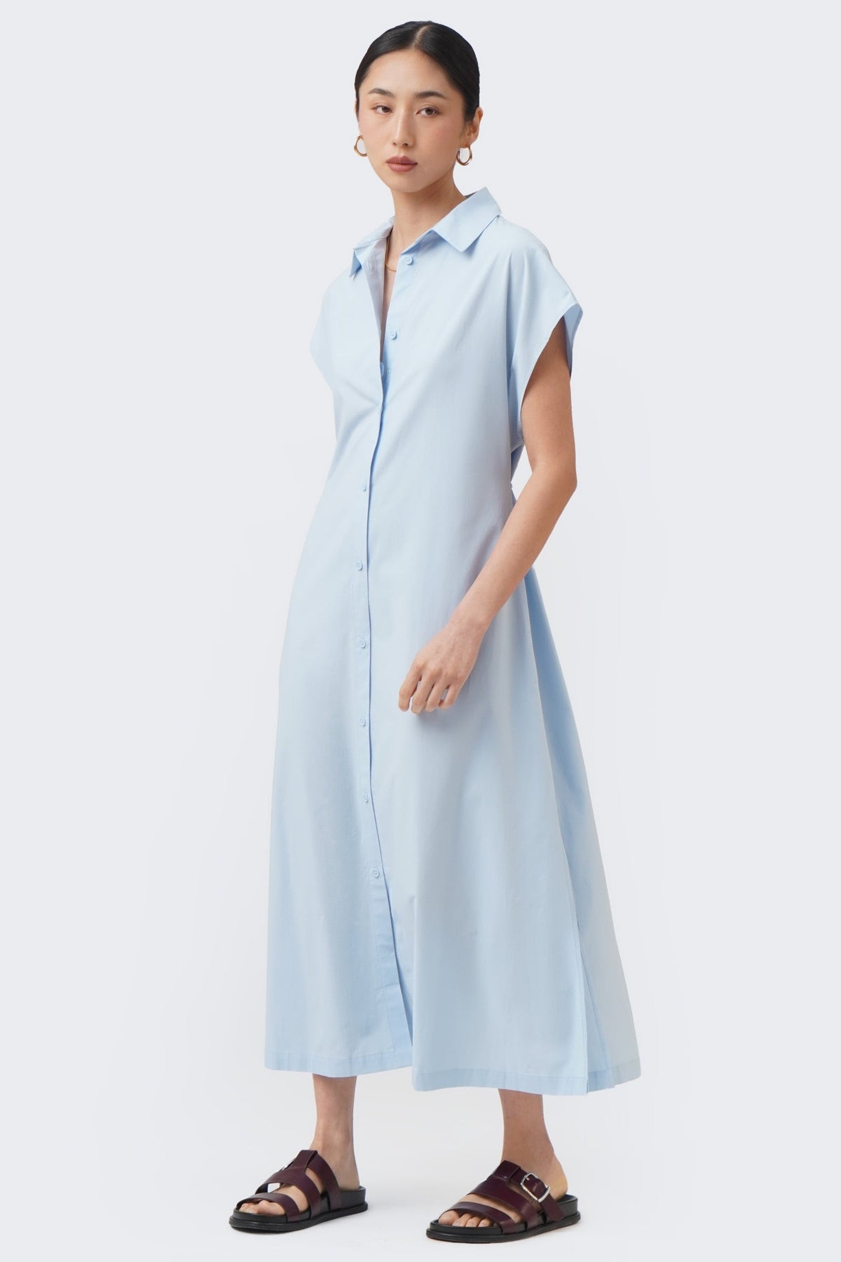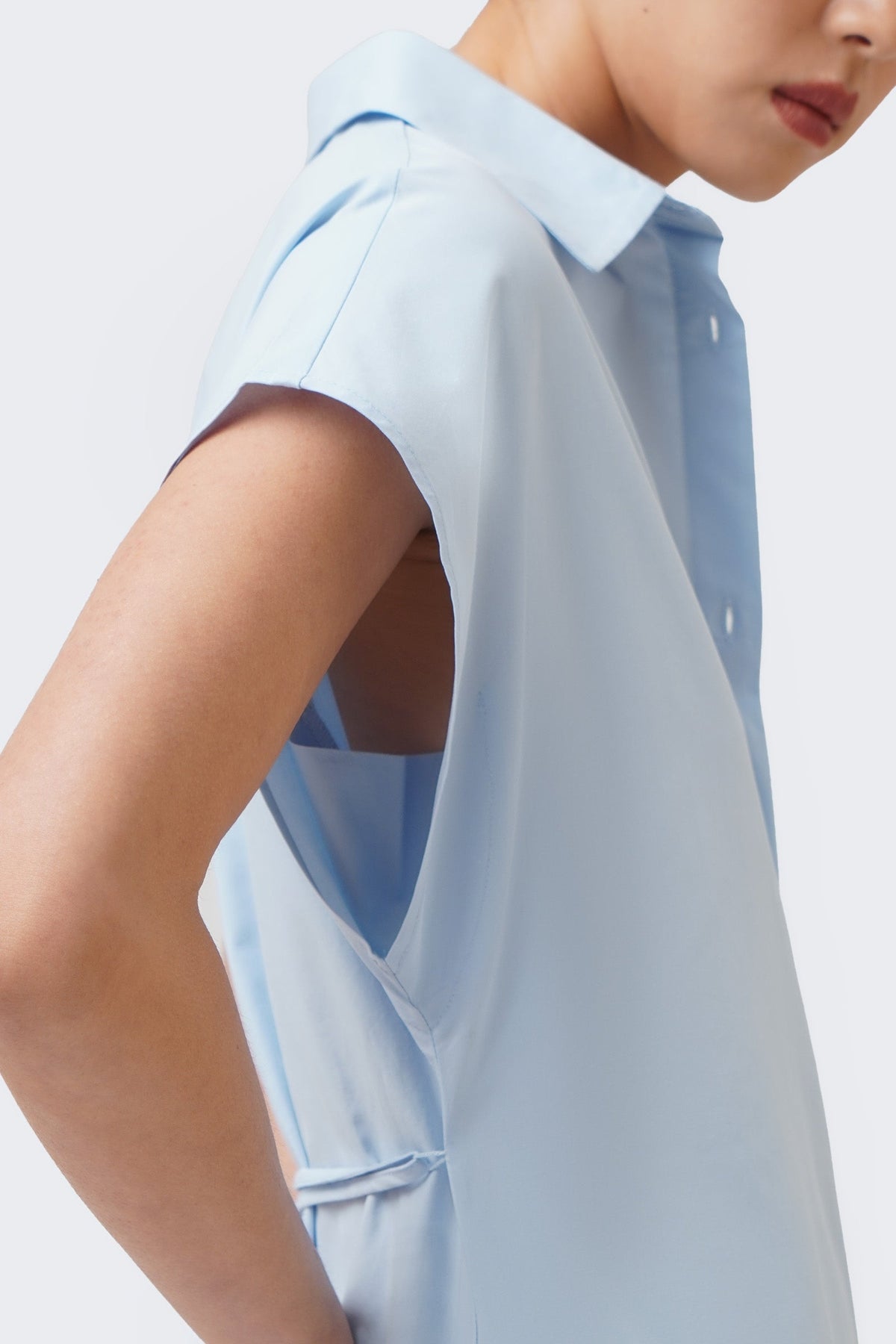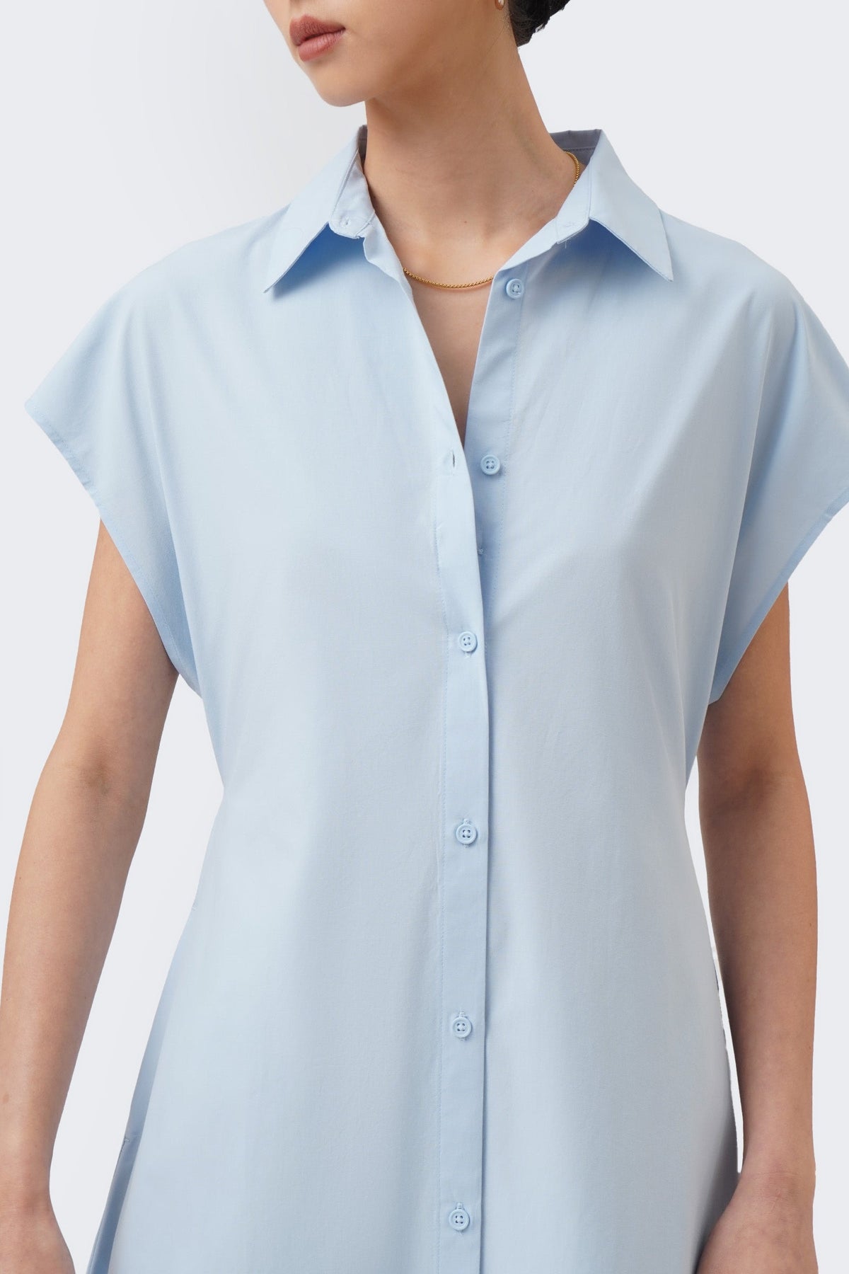 The model is 170cm/5'7" and wears a size Medium for color Pale Blue