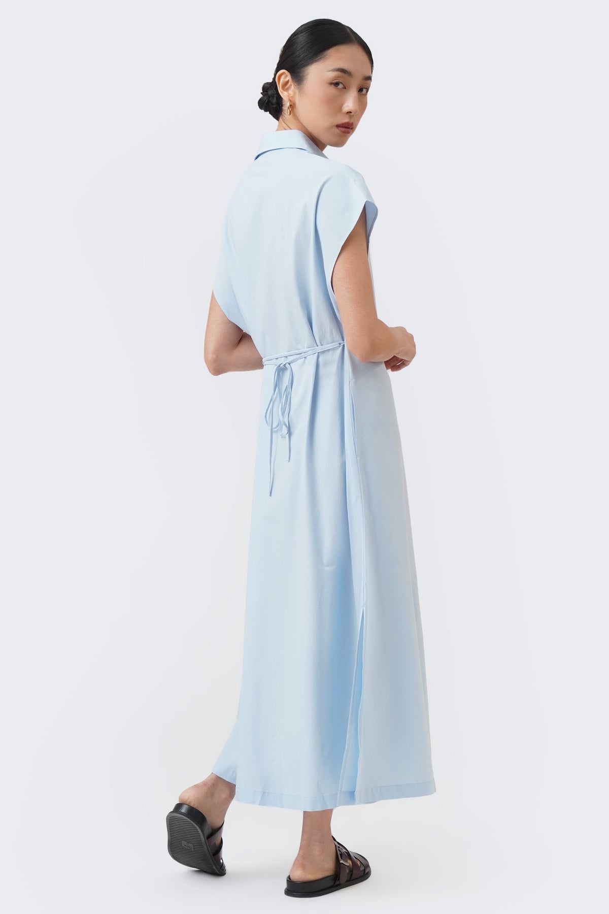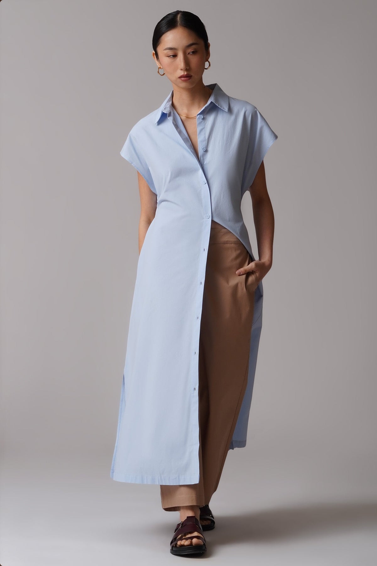 • Design Details: Standard Collar, Button-Up, Self Tie Waist and Funnel Sleeves with Gusset