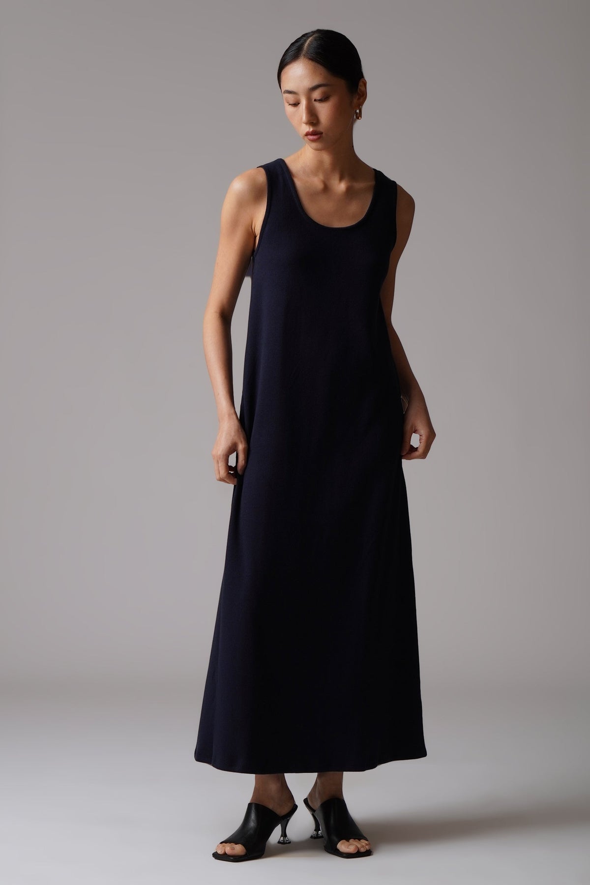 The model is 170cm/5'7" and wears a size Medium for color Indigo