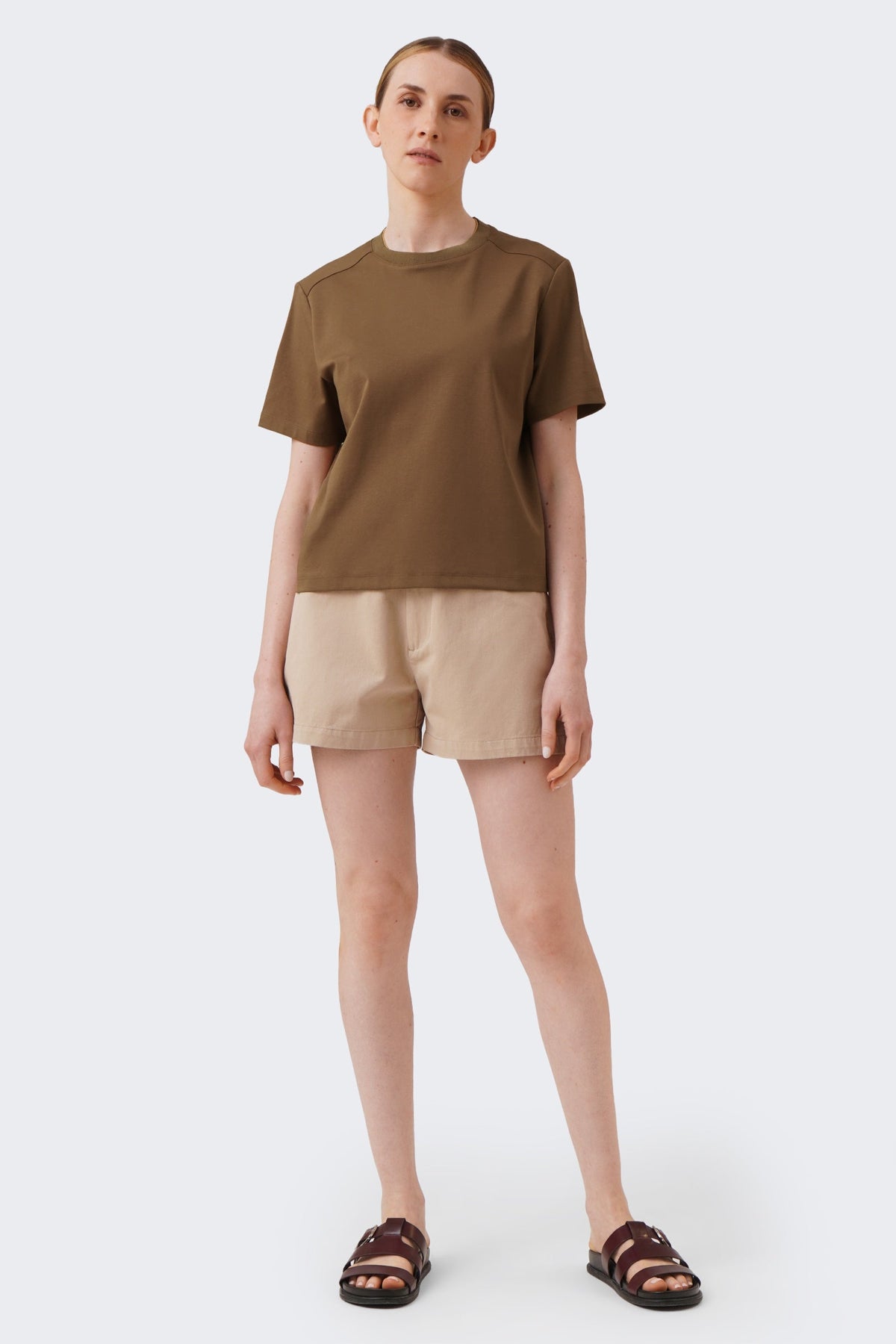 The model is 173cm/5'8" and wears a size Medium for color Caramel