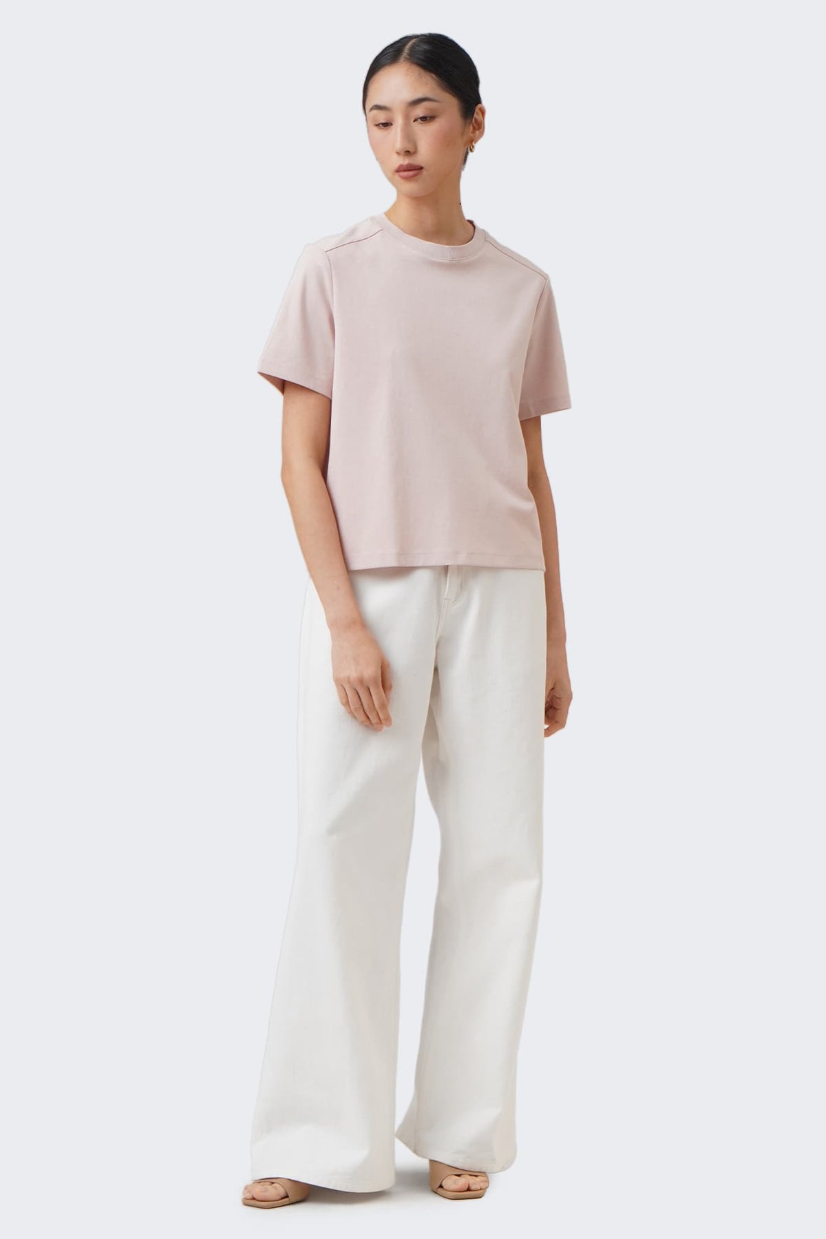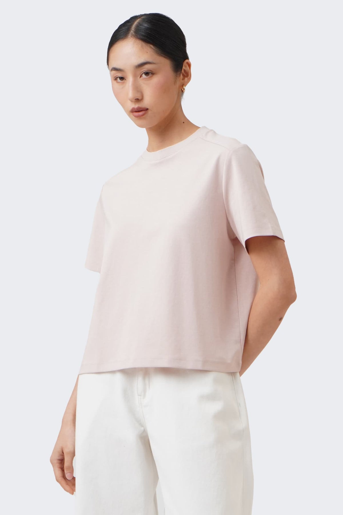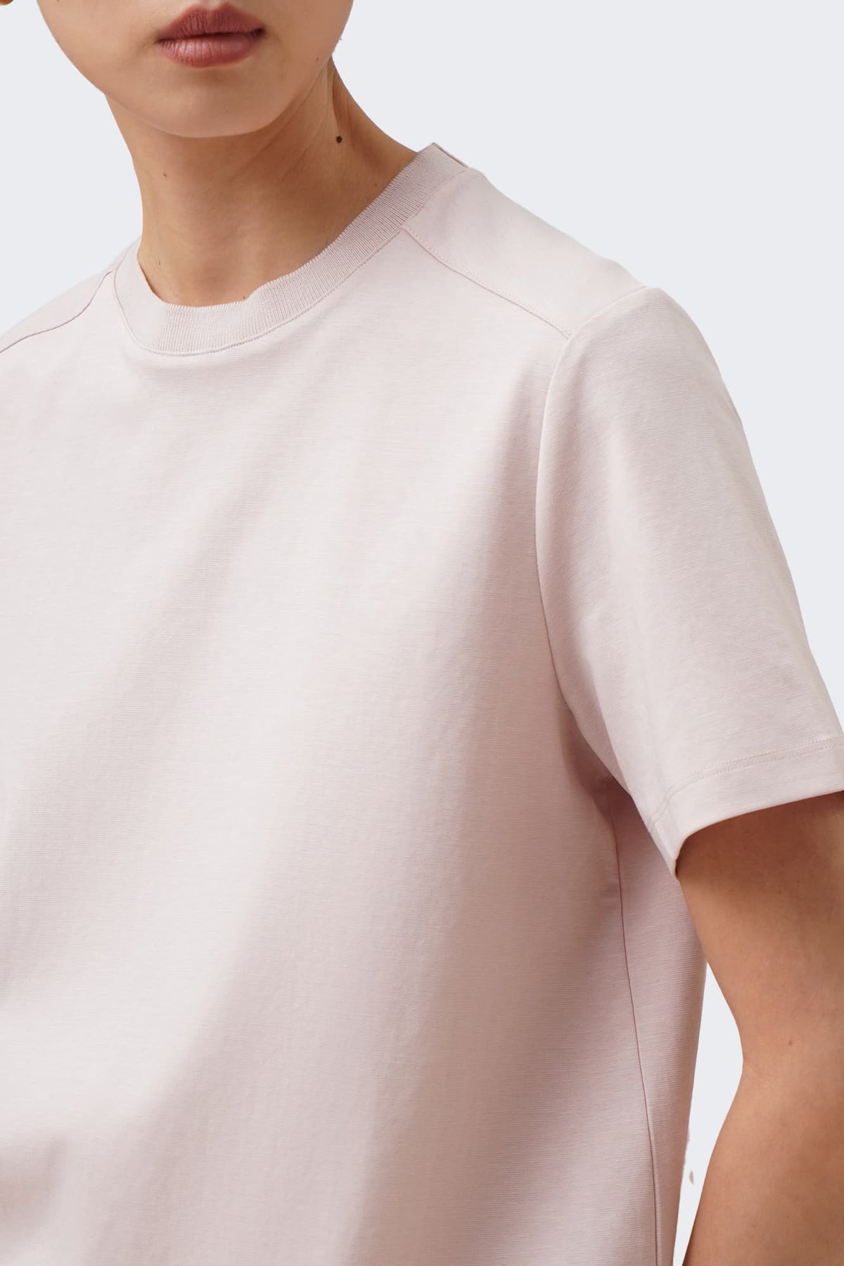 The model is 173cm/5'8" and wears a size Medium for color Soft Blush