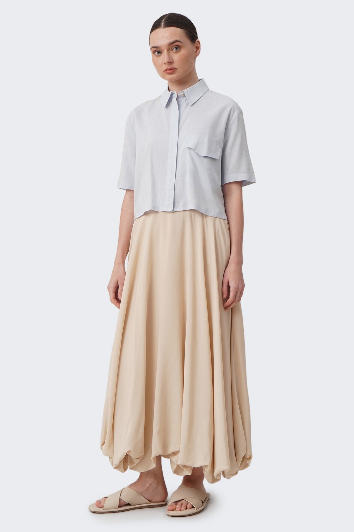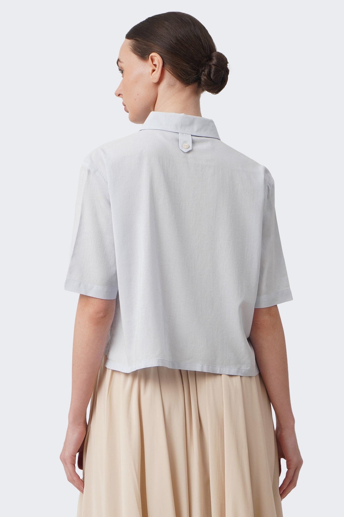 The model is 171cm/5'6" and wears a size Medium for color Pale Blue