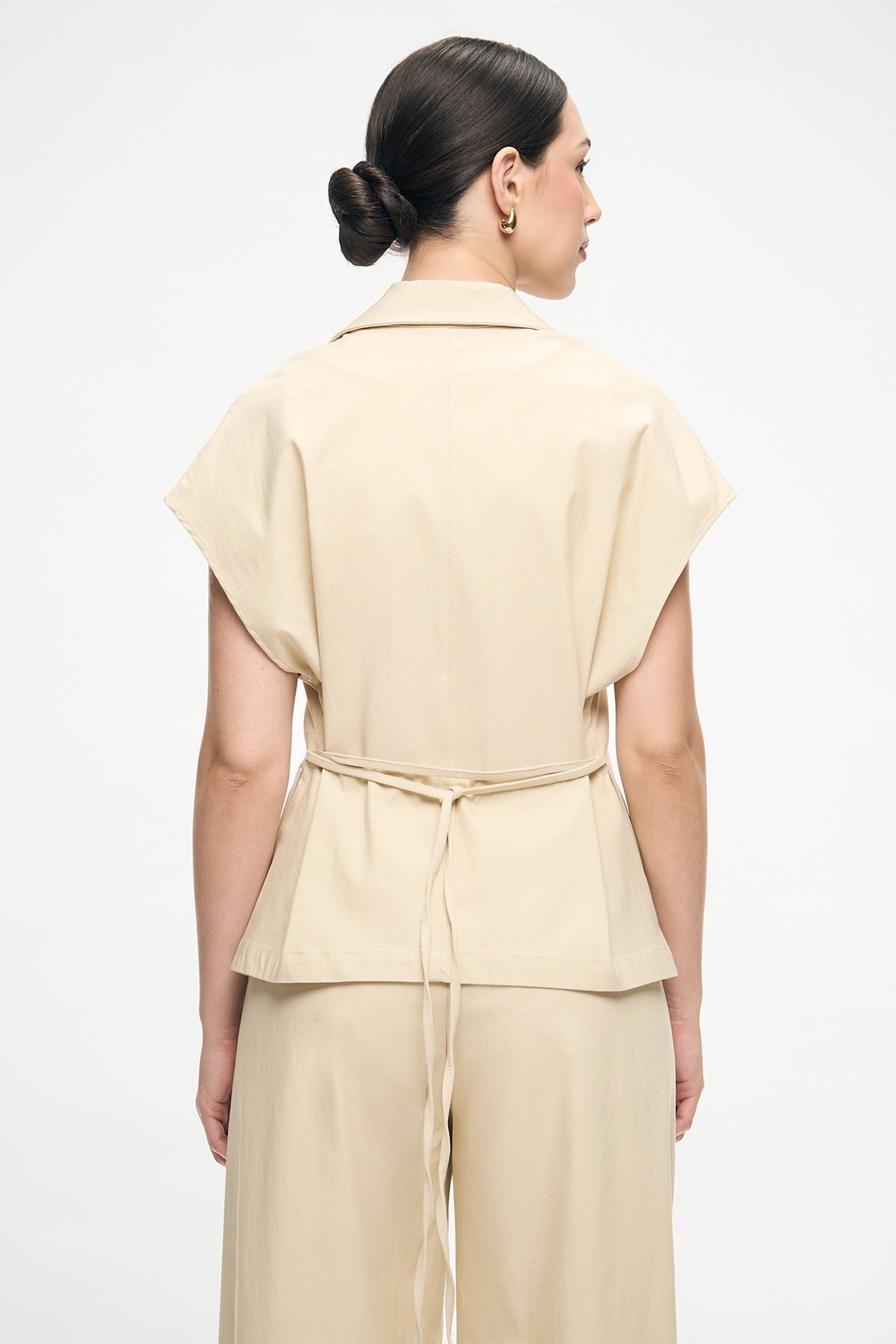 • Design Details: Notch Collar, Extended Shoulders, Funnel Sleeves, Side Slit Pockets, Tie Detail