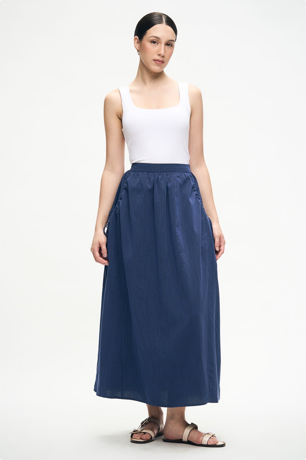 • Design Details: Gerterized Back Waist, Drawstring Pouch Pockets, A-line Skirt