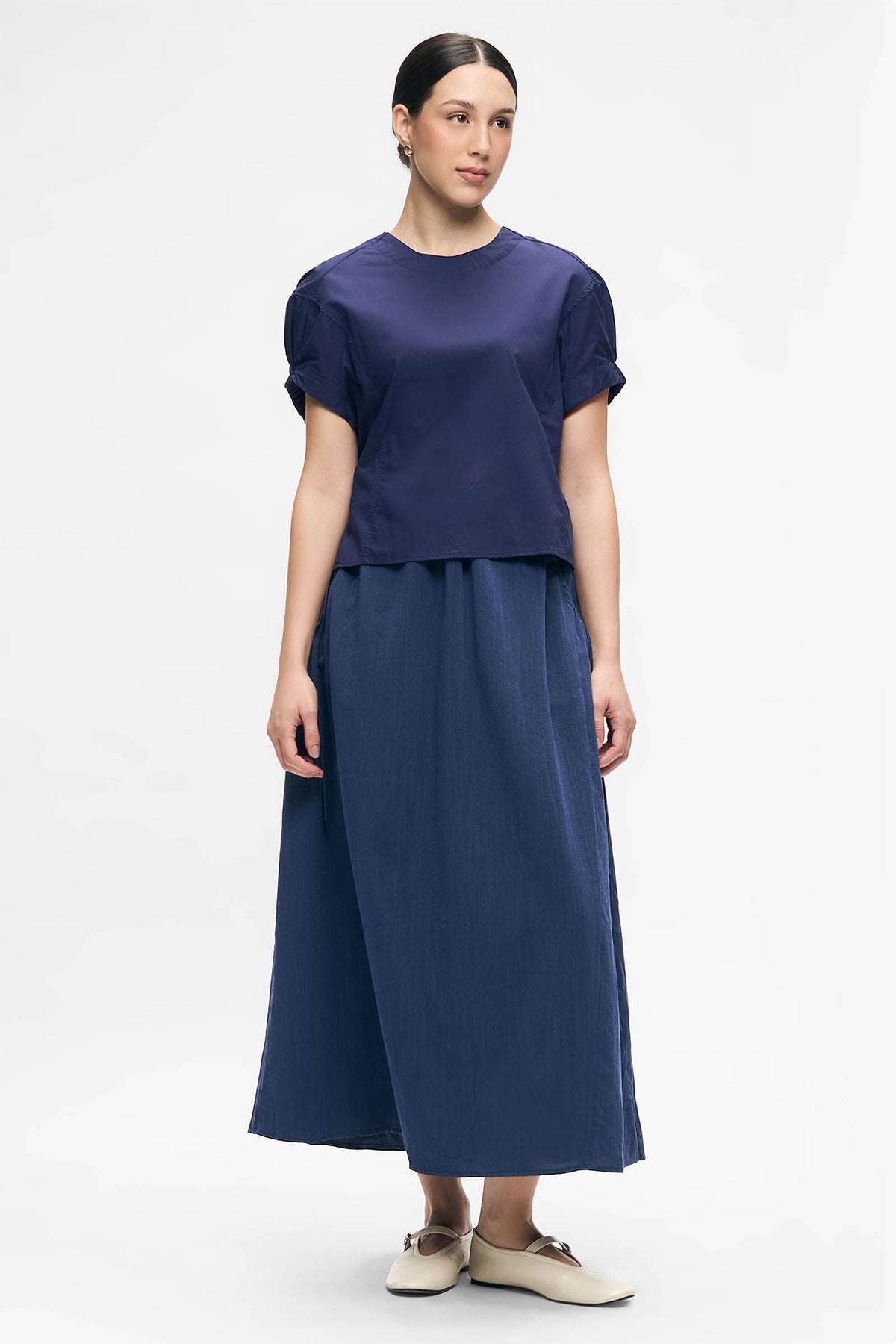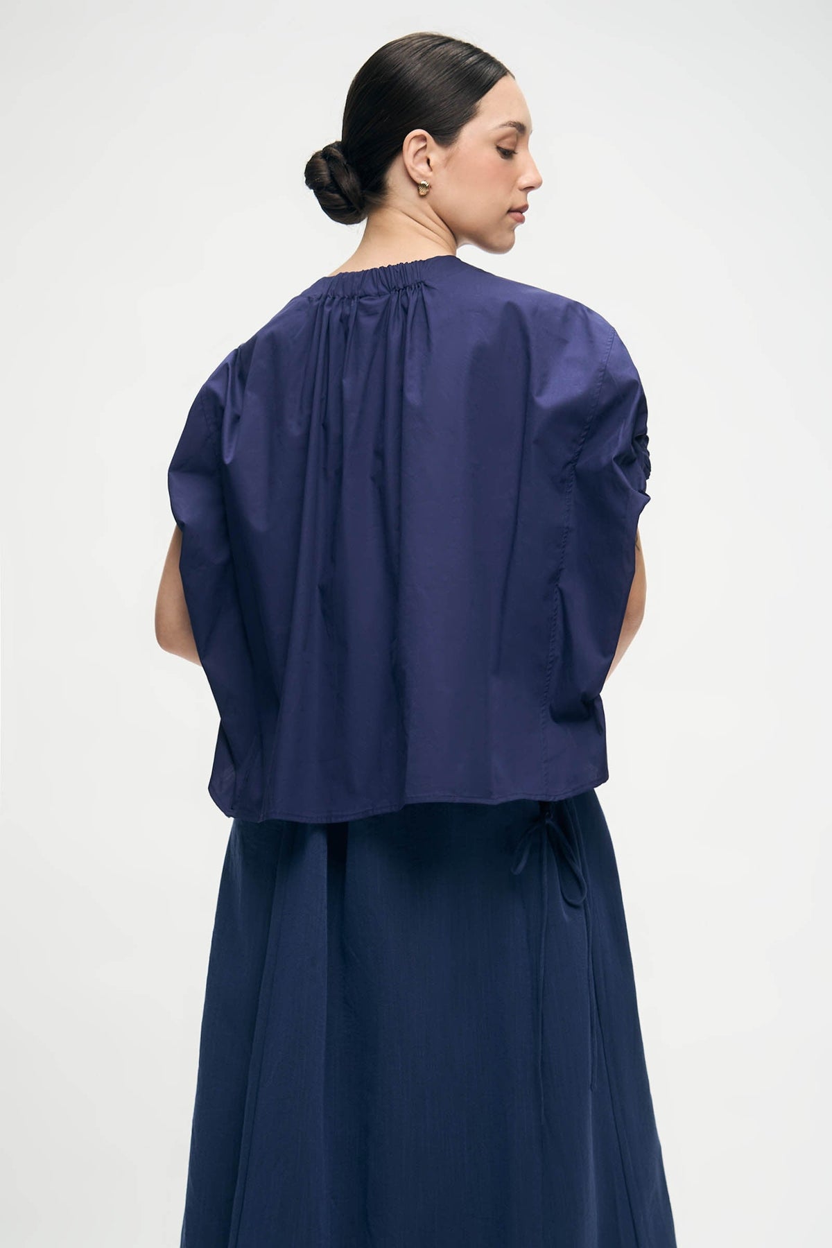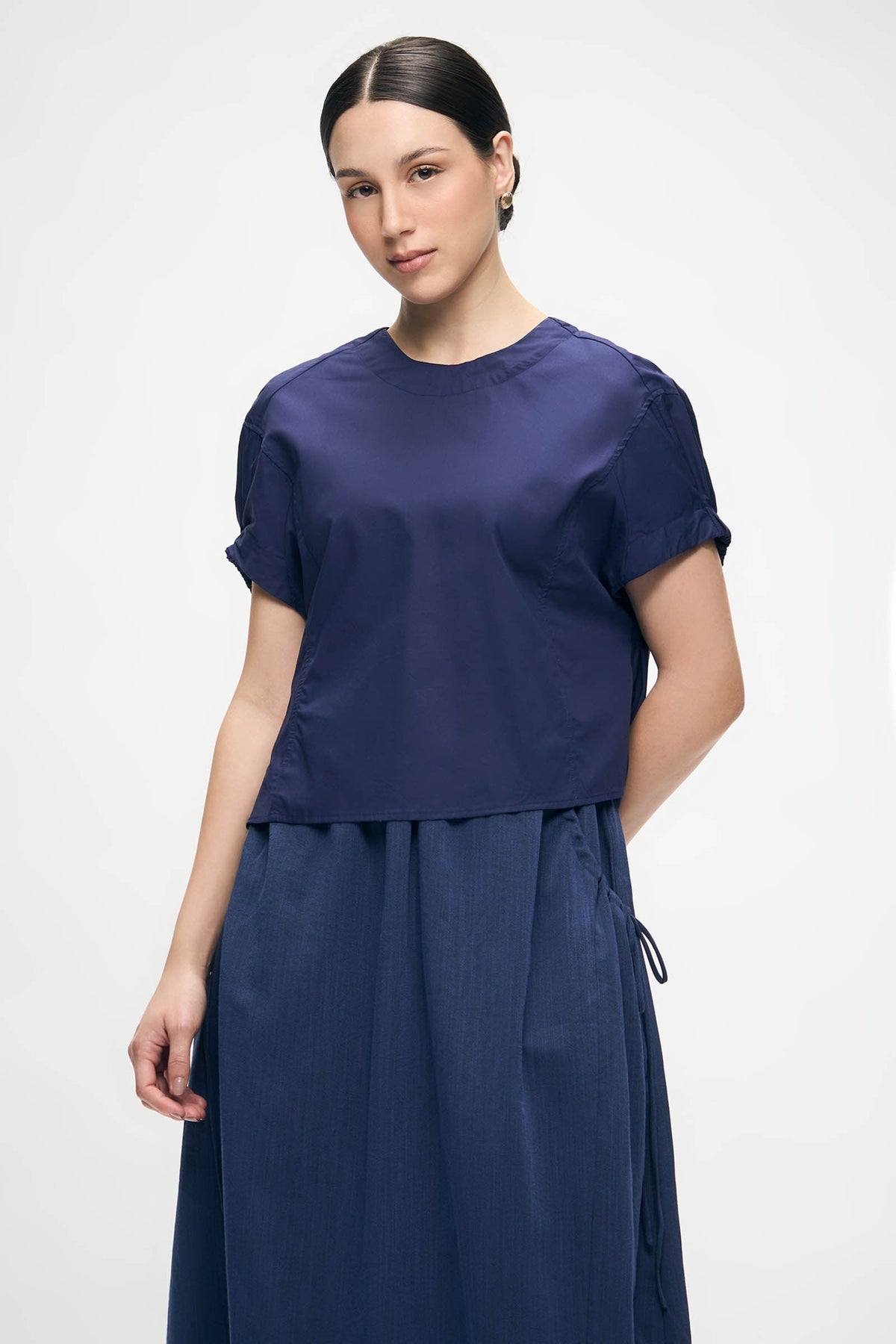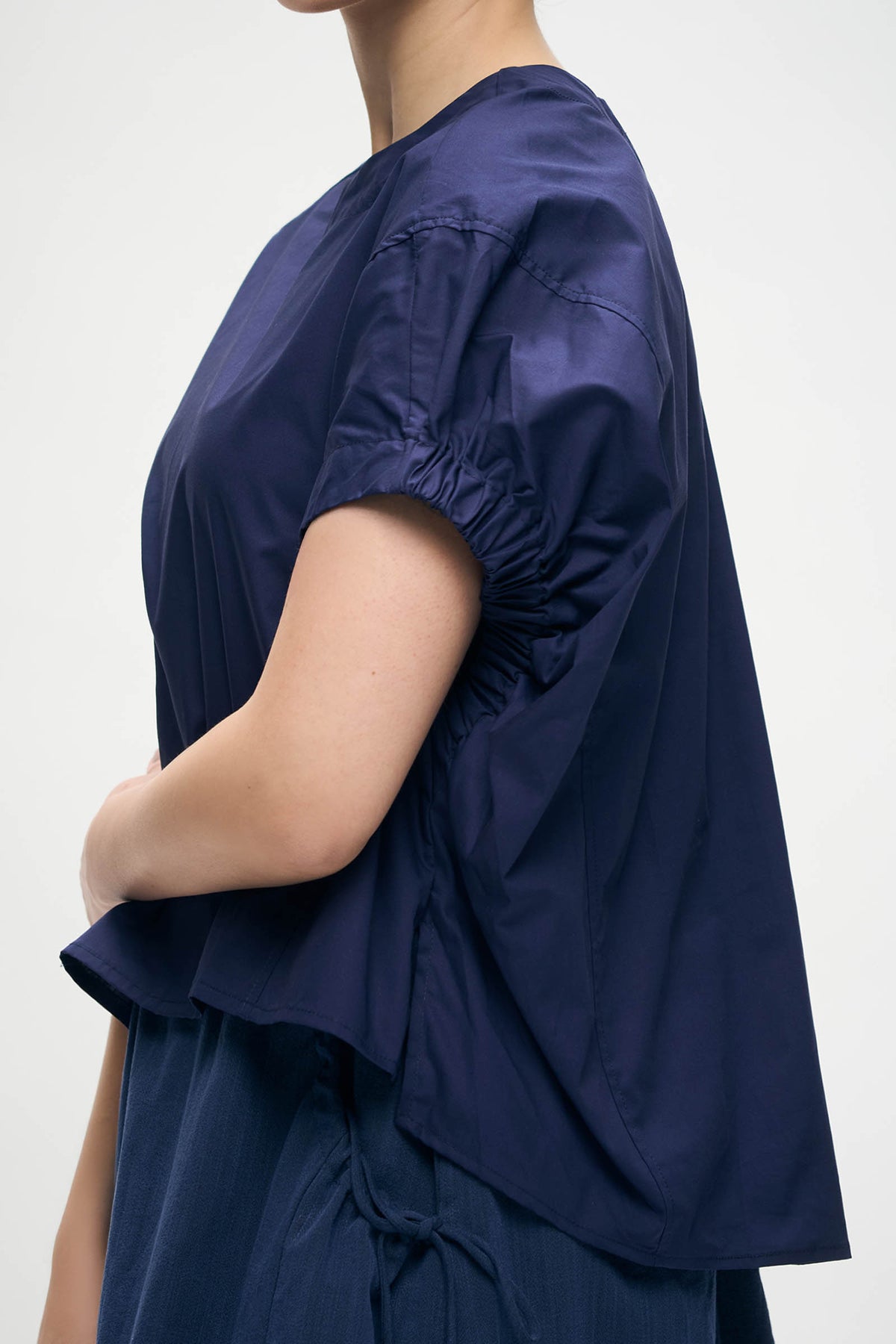 • Design Details: Round Neck with Gartered Back, Front and Back Panels, Panel Puff Sleeve, High-Low Hem, Side Slit
